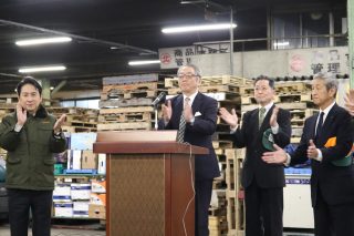 早朝6時50分、北九州市中央卸売市場の青果棟にて、2026年せり始め式が開催されました。